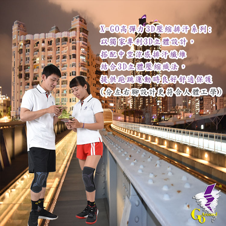 X-GO涼感吸濕排汗鈦藍色彈簧護膝[GoAround夠有勁護具]系列: 以獨家專利3D立體設計,搭配中空涼感排汗纖維結合3D立體壓縮織法,提供跑跳運動時良好舒適保護